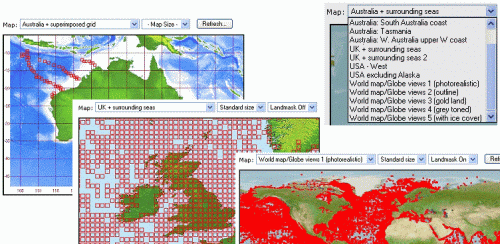 Advantages of this display method include the ability to see all countries and landmasses at their true size and proportion irrespective of where on the Globe they may be, plus the ability to view polar regions in their true shape (which is not possible with the 2-d maps). Please note, however, that these maps cannot be used to access "click-on-a-square" functionality at the present time, which is accessible (where activated by the requesting client application) from the flat (2-d) maps only.