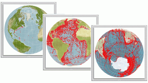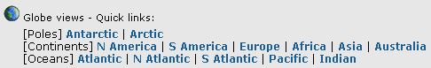 Thirteen different starting points are offered for the globe views, including both poles, 6 continents, and 5 oceans, and also the globe can be tilted and rotated seamlessly from any starting point to obtain the preferred viewpoint and/or zoom start position. (Note, however, that - for logical reasons - you cannot go "south" from the south pole, or "north" from the north pole).