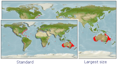 "Standard size" maps are typically 600 pixels (world maps) or less (other maps) in width. This setting will produce maps that will potentially fit onto standard (portrait orientation) pages for printing, and also will be quicker to download over a slow link (e.g. typical file size is around 45 KB). "Large size" maps are typically 900 pixels wide (world maps, less for others) and so offer improved detail, but with a corresponding increase in in file size (e.g. to around double the size of that for a "small" map), and may require printing in "landscape" mode. Selecting a "Large" world map is also a necessary step for the links to "globe views" to appear (see below).