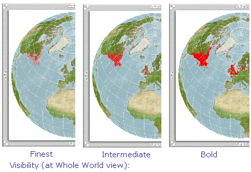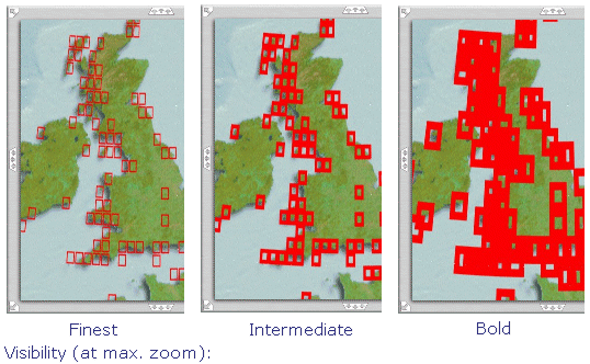 The "visibility" setting controls the thickness with which the square boundaries are drawn, and also the size of the rendered squares (which are oversize on the "Bold" setting). Setting visibility to "Bold" (default for large maps) wil enable the squares to be relatively easy to see at low to moderate levels of zoom (including "whole world" views) if it is desired to access the "globe views" functionality. Setting visibility to "intermediate" or "finest" will result in the squares looking increasingly well defined at high zoom levels, which can be an advantages for images that are to be printed or saved, however their visibility when zoomed fully out may be substantially reduced. It is a good idea to experiment somewhat with suitable "visibility" settings that correspond with the nature of the data being plotted as well as the eventual "target" level of zoom to be used for display.