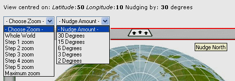 - "Globe views" allows access to visualisations that range from "earth from space" when fully zoomed out (which is the default), through six zoom steps to approximately country scale or better. These maps can also be panned ("nudged") in any of eight directions (N, NE, E, SE, S, SW, W and NW) in user defined steps ranging from 30 to 2 degrees, selectable using the "nudge amount" box. These globe views open in a new window and the requested changes (zoom or nudge) activate immediately on selecting, without requiring a "refresh" button.The speed you will see the new image appear will depend on the speed of your network connection, but can be as rapid as every 2 seconds or so for "whole world" views on a suitably fast link.