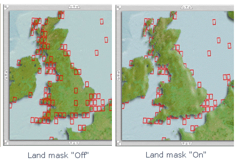 - The "land mask" function will suppress portions of squares that overlap the land, allowing the coastline to be visible (which is frequently preferred, for example, when displaying marine-only data). Where a land mask is available for a specific map, the "land mask" selection box will automatically appear; select the relevant option "Landmask Off" or "Landmask On", then press "Refresh" to obtain the desired map appearance.